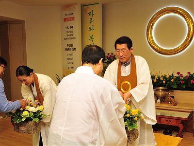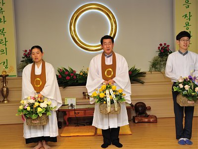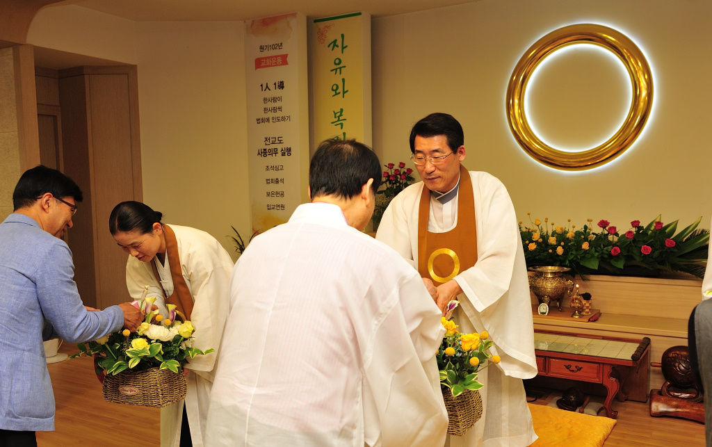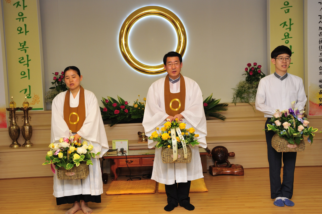 원기 102년 5월 14일 스승의 날을 맞이하여 혁산 양원석 교감교무님, 김태연 교무님, 최호천 교무님께 감사의 꽃다발을 분당교당 회장단에서 전달 드렸습니다.