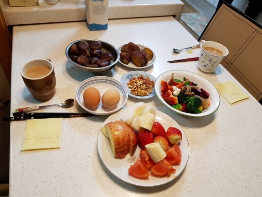 밥이 사라지고 고구마, 빵(가끔)과 과일, 채소, 계란에 견과류, 치즈, 소시지도 등장합니다. 음료는 전에 우유만 마시다 요새는 젊은이들 영향으로 커피에 우유를 타서 마십니다.