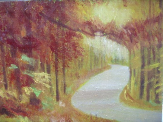 전타원의 가을풍경. 아직 완성되지도 않은 유화를 성 급한 사람이 올려보았습니다. 길은 유혹의 손길 같습니다. 저너머 미지의 세계를 탐하는 마음 때문일까요? 함께 걸어보고 싶네요.