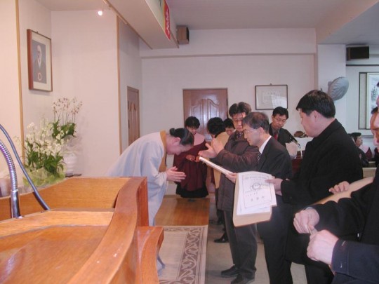 신임조제민회장의 취임사에이어 부회장단 분과장 단체장들이 불단앞에 나와 교도님께 간단한 인사말을 하였다.